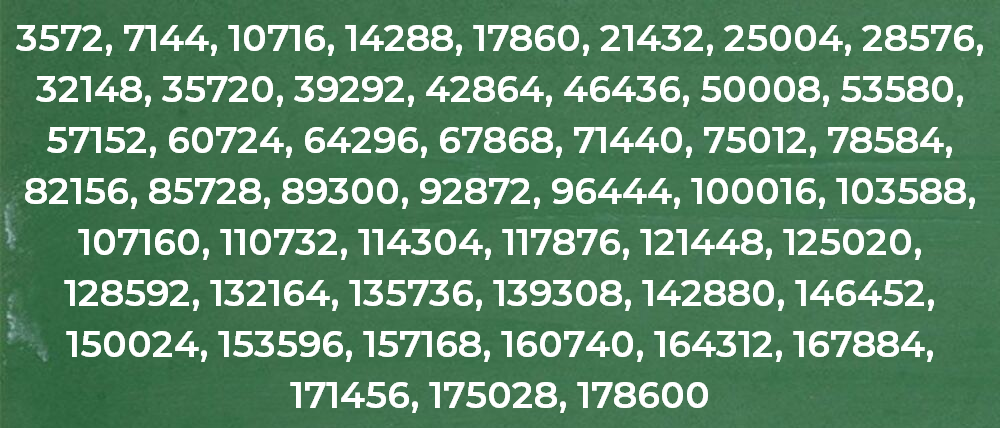 3572, 7144, 10716, 14288, 17860, 21432, 25004, 28576, 32148, 35720, 39292, 42864, 46436, 50008, 53580, 57152, 60724, 64296, 67868, 71440, 75012, 78584, 82156, 85728, 89300, 92872, 96444, 100016, 103588, 107160, 110732, 114304, 117876, 121448, 125020, 128592, 132164, 135736, 139308, 142880, 146452, 150024, 153596, 157168, 160740, 164312, 167884, 171456, 175028, 178600.