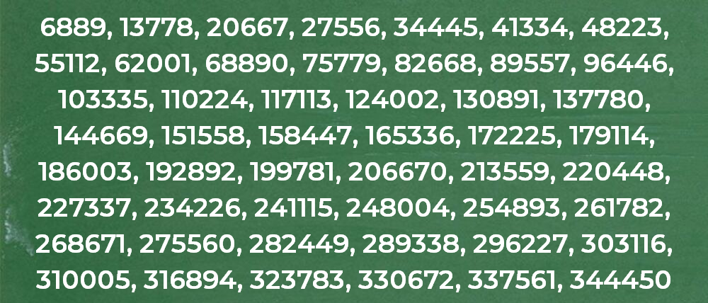 6889, 13778, 20667, 27556, 34445, 41334, 48223, 55112, 62001, 68890, 75779, 82668, 89557, 96446, 103335, 110224, 117113, 124002, 130891, 137780, 144669, 151558, 158447, 165336, 172225, 179114, 186003, 192892, 199781, 206670, 213559, 220448, 227337, 234226, 241115, 248004, 254893, 261782, 268671, 275560, 282449, 289338, 296227, 303116, 310005, 316894, 323783, 330672, 337561, 344450.
